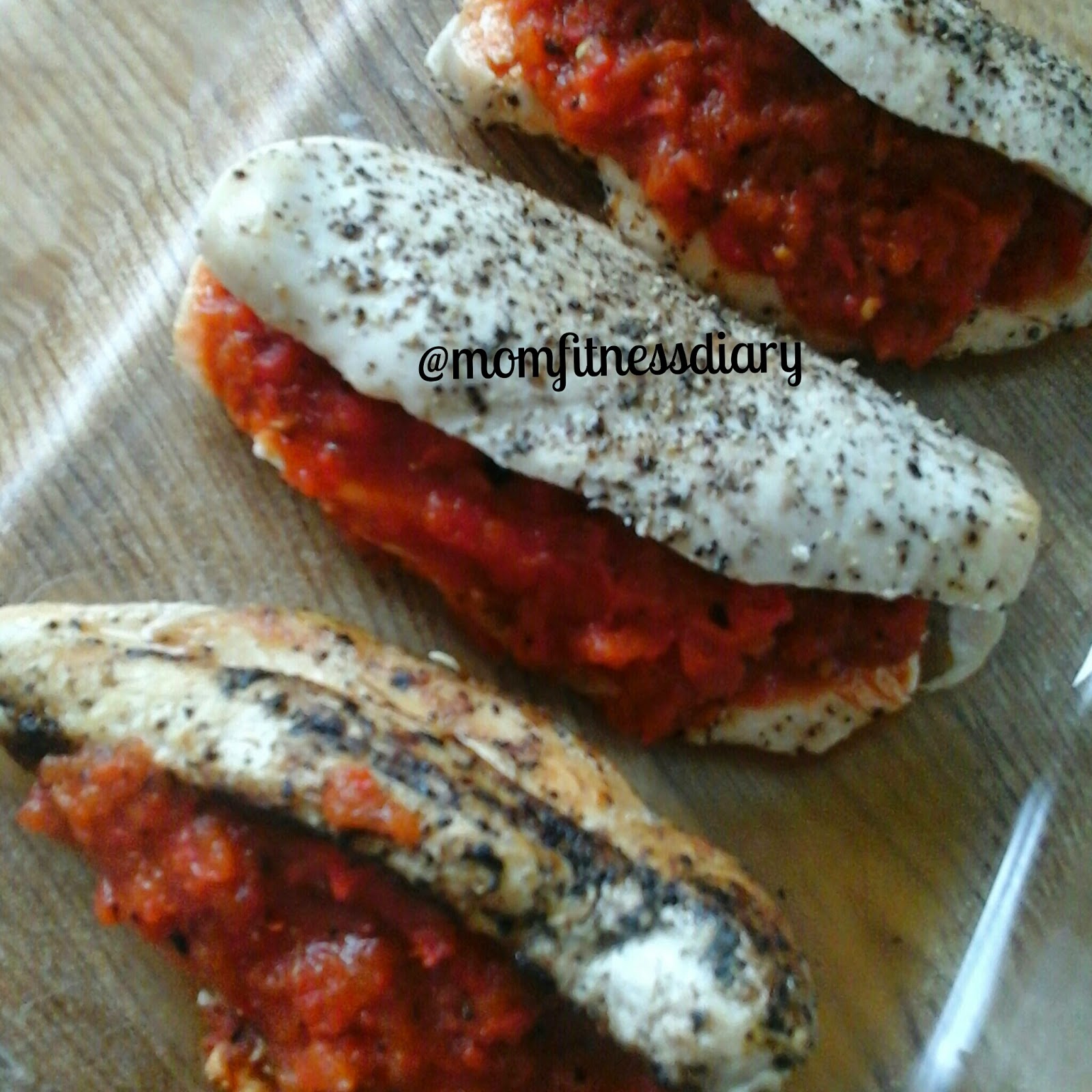 Cut 4 pieces of raw washed chicken breast sideways and refill with a slice of feta and a spoonful of the sauce and pop into the oven for about 40 minutes at 200 degrees Celsius.