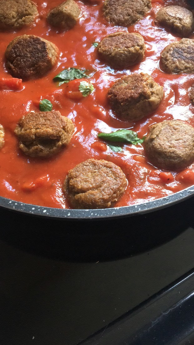 Heat up a second frying pan with some oil. Form the balls and brown them for a bit. Once browned all over put them inside the sauce!