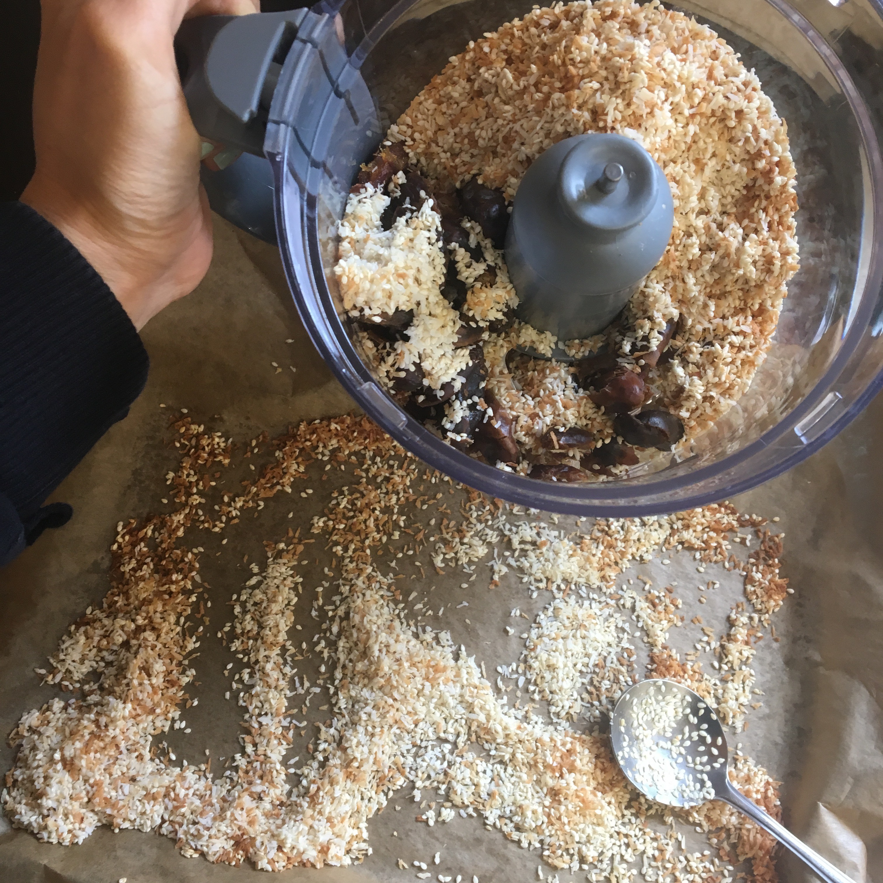 Place the coconut and seeds in a tray and roast for 10 minutes moving them around often.