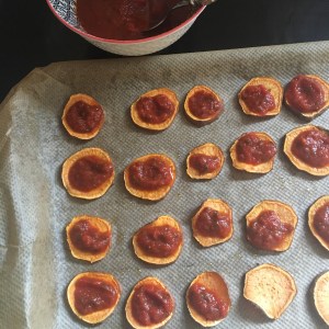 So once your sweet potato is sliced. Add a teaspoon of the tomato sauce on top of each slice: