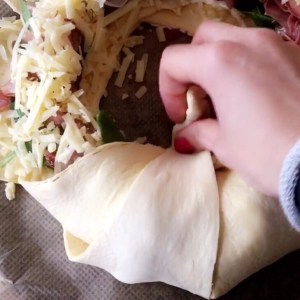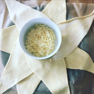 Step 3: Finish by adding more cheese and then remove the plate and start bringing the pasta triangles inside to form the crown