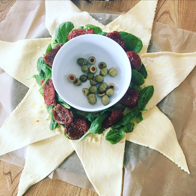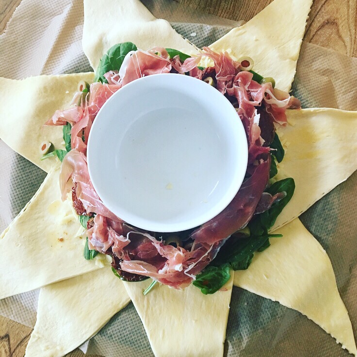 Step 1: place a bowl in the middle of a pizza tray and place the croissant pastry triangles around the bowl like this:
