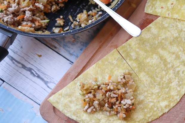 6. Fill each wrap triangle with the mix of the meat and fold into a tiny burrito