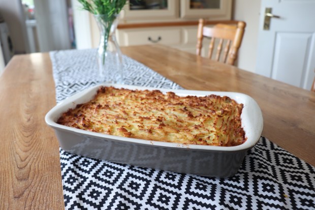 4. Place mince mix in a rectangular baking dish. Top with the potato and bake for 30 minutes.