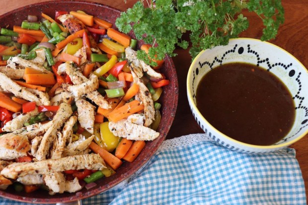 3. Mix the chicken and veggies together and add the soya-honey sauce