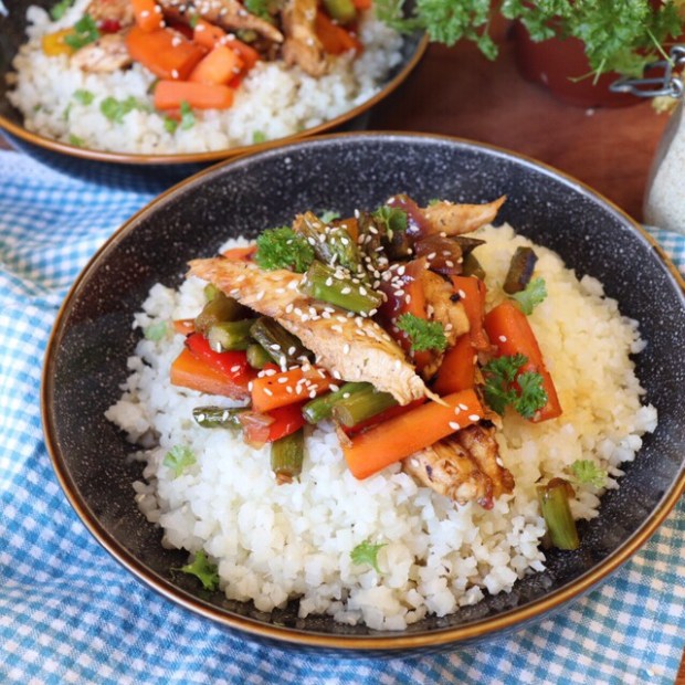 Some people have been asking me on Instagram if the cauliflower had the same bite as normal rice and the answer to that is yes it does! It’s the same consistency as normal rice but with a lot less calories.
