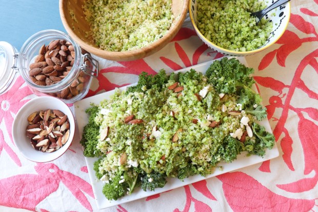 Mix in the broccoli Rice with the couscous, add pesto jar, almonds and feta cheese.