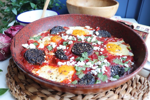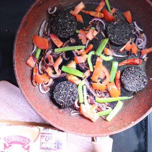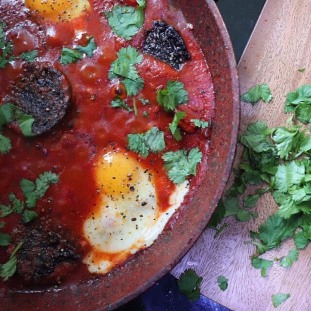 Anyway here is recipe:One pan huevos rancheros with black pudding: