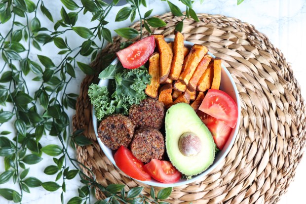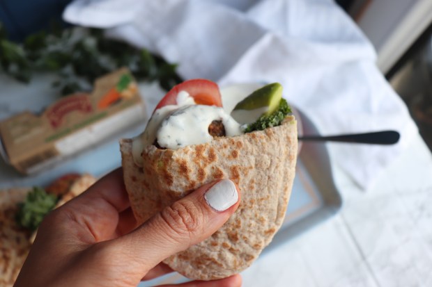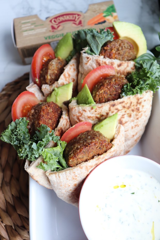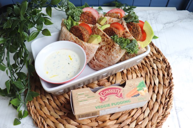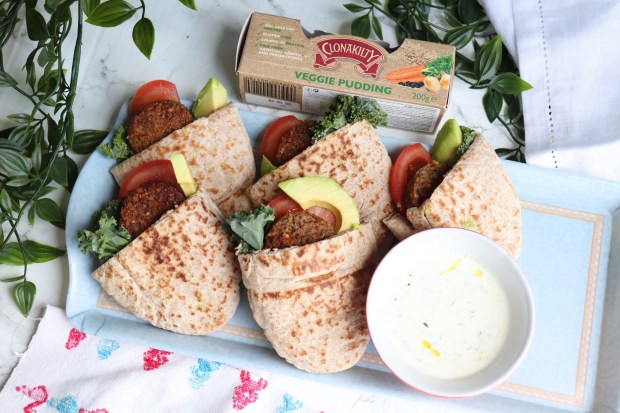 Toast pittas and fill them in with avocado, kale, tomato, red onion and of course your Clonakilty veggie Pudding